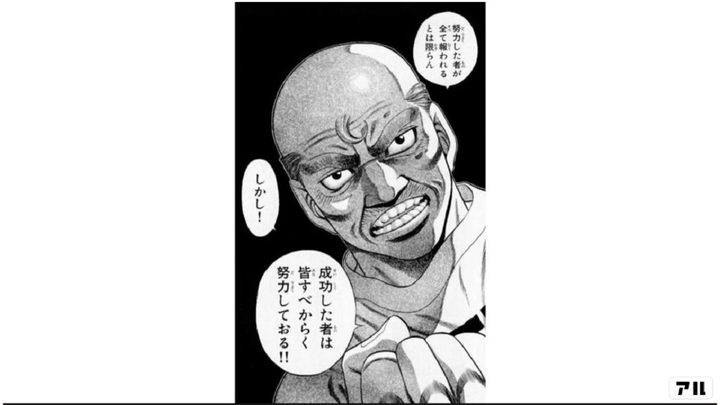 努力した者が全て報われるとは限らん。しかし 成功した者は皆すべからく努力しておる!